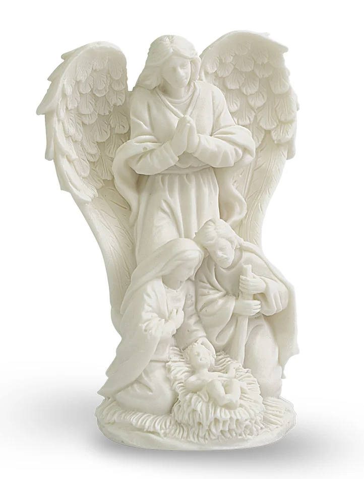 Preciosa escultura de la Natividad con Angel protector, realizado en resina blanca.