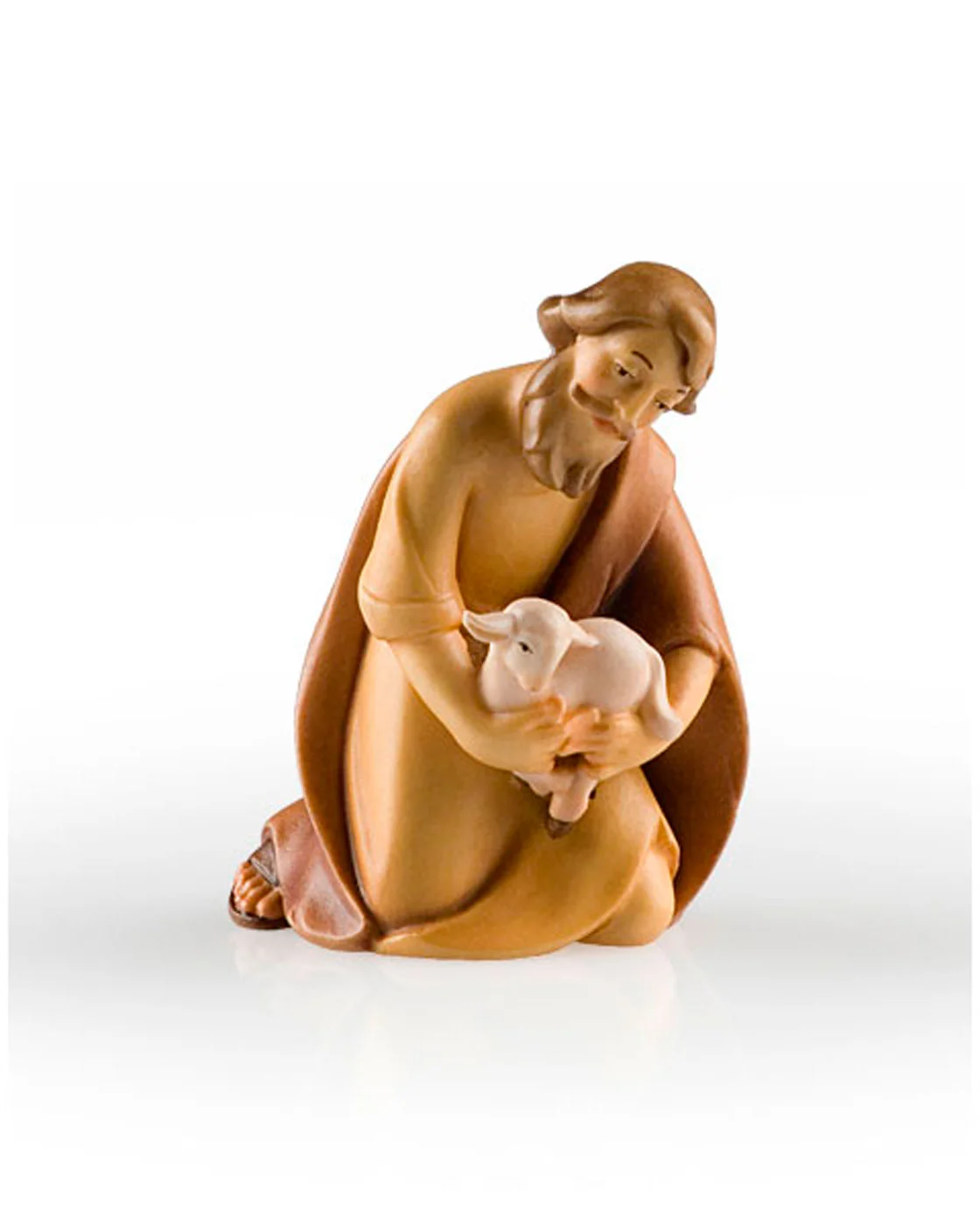 Imagen de madera tallada. Pastor arrodillado con cordero en maderas nobles.