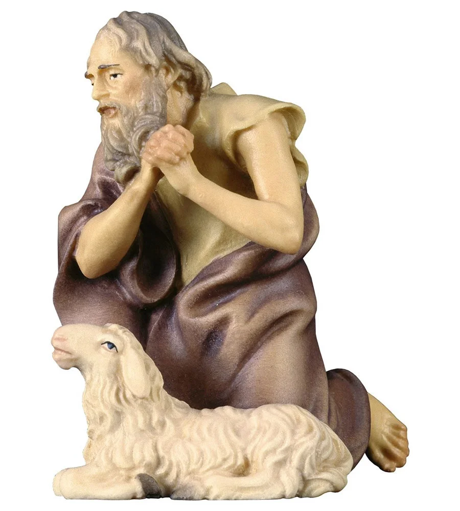 Pastor con oveja en talla de madera natural. Varios acabados disponibles.
