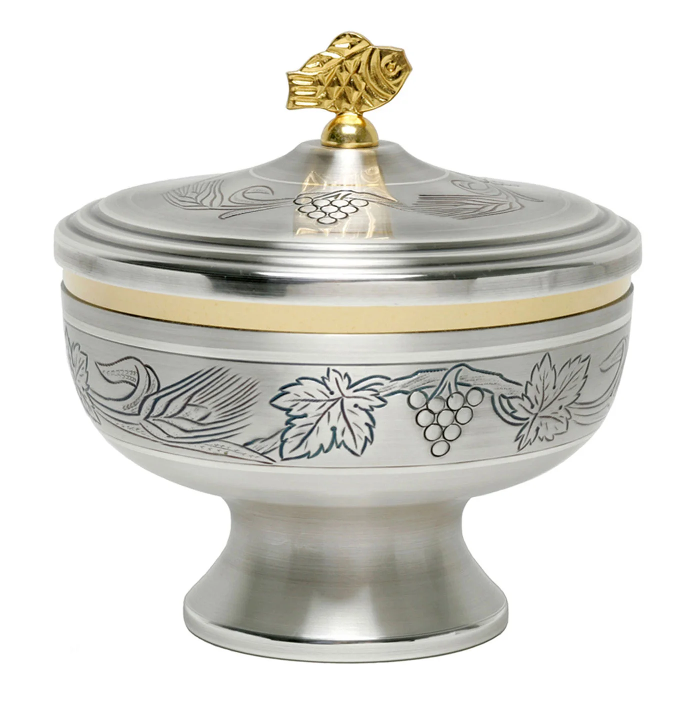 Copón-Patena grabada con cubierta de metal de estilo clasico con baño de oro. Disponible en acabado dorado o plateado.