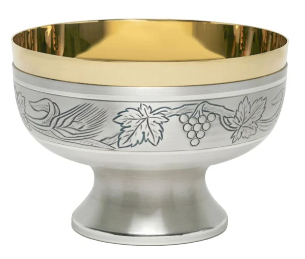 Copón-Patena grabada de metal de estilo clasico con baño de oro. Disponible en acabado dorado o plateado.