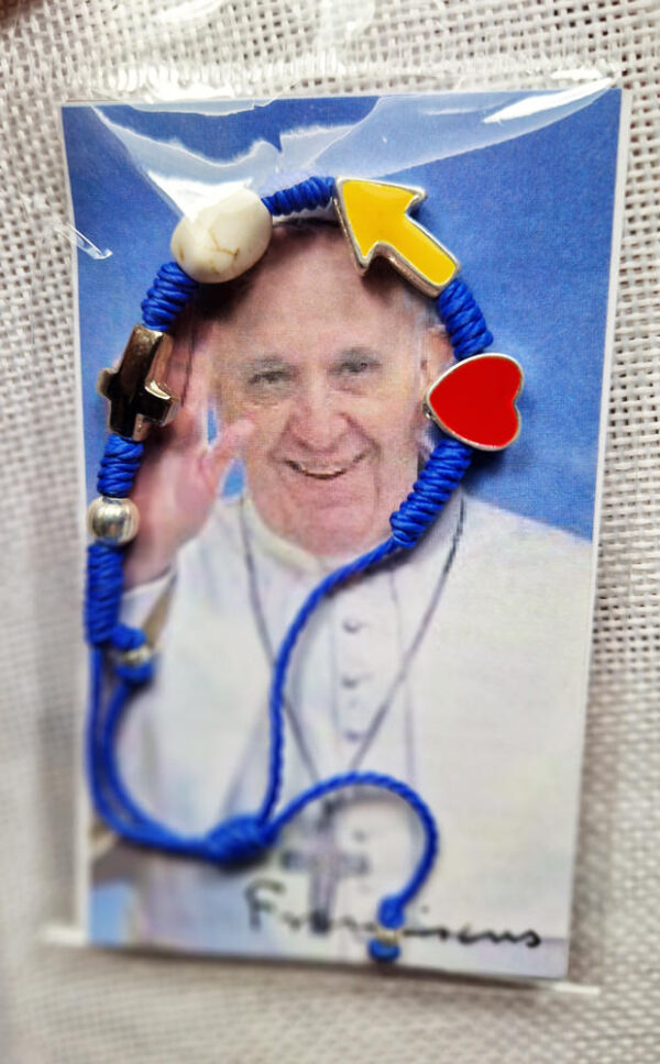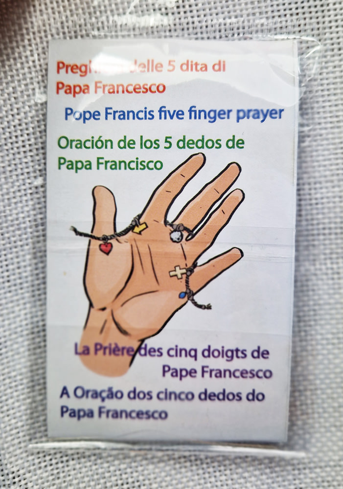 Brazalete de la oración de 5 dedos del Papa Francisco, realizado en cuerda y metal. Imprescindible para enseñar a los más pequeños cómo orar para el prójimo con esta famosa oración.