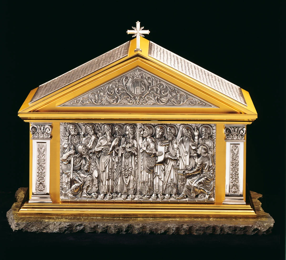 Sagrario en fusión de latón y cobre en acabado bicolor, con el motivo de los doce apóstoles. Cerradura de seguridad.