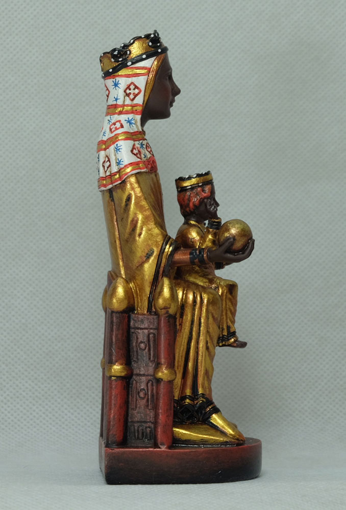 Escultura de la Virgen de Montserrat en fibra de vidrio, realizada artesanalmente. De una gran elegancia y calidad, decorada con una fina policromia. Medida: 20 cm.